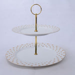 The "Dotty Delight" Collection brings to your gatherings the White Gold Polka Dots 2-Tier Serving Plate, a charming addition that blends functionality with a sprinkle of playfulness. This two-tiered serving piece is not just a practical solution for space-saving elegance; it's a statement of style that adds a golden touch to your tea-time and entertaining essentials.